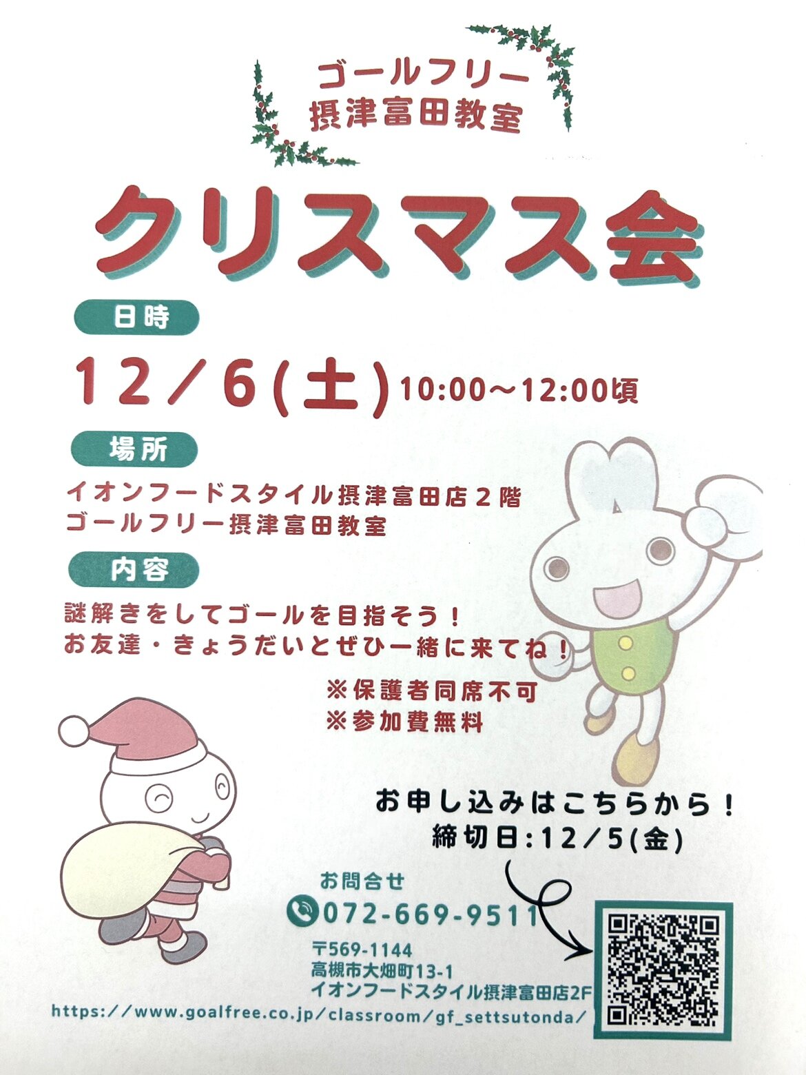12月6日(土)、ゴールフリー摂津富田教室にてクリスマスイベントを開催いたします。