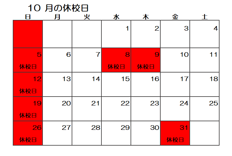 10月5日(日)・8日(水)・9日(木)・12日(日)・19日(日)・26日(日)・31日(金)