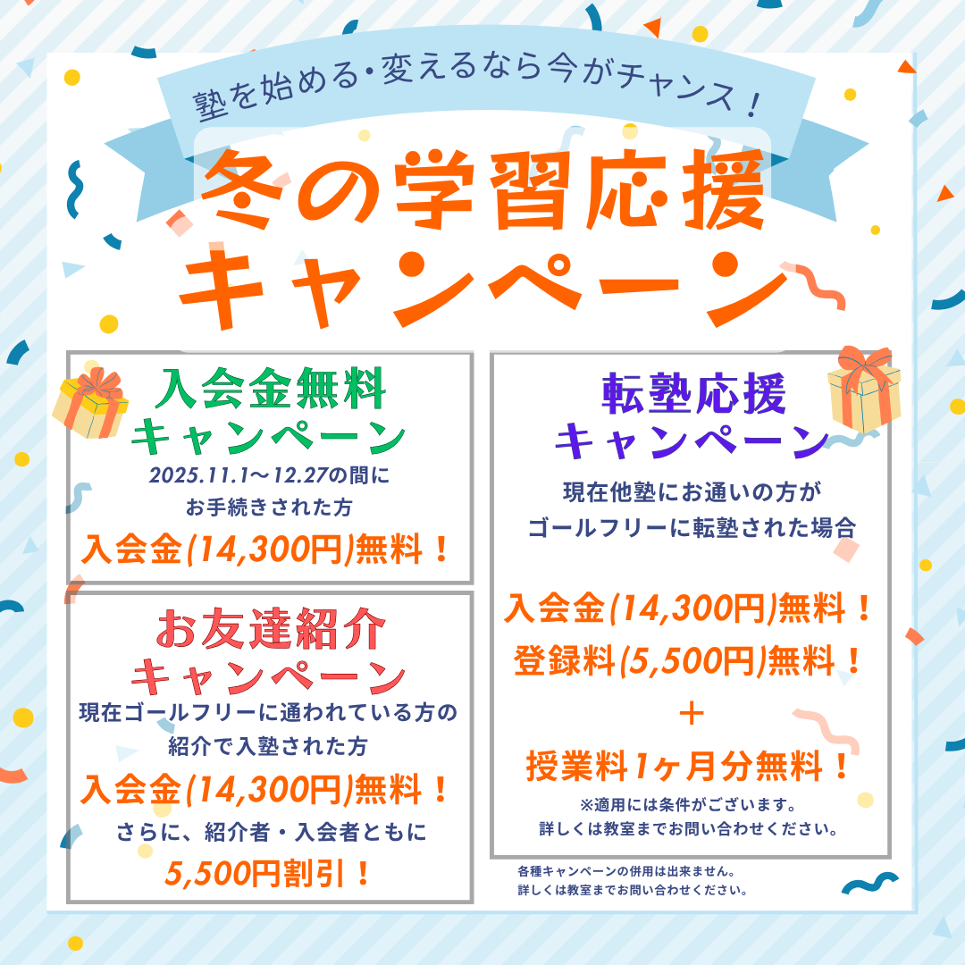 最近、学校の算数のテストで「70点以上取れたー!ゴールフリー効果かも!」と嬉しそうに帰宅しました。 学校帰りに塾で宿題ができるのも親として大変有り難く、居心地良い空間で勉強させて頂けてることに感謝です。 引き続きよろしくお願いします。